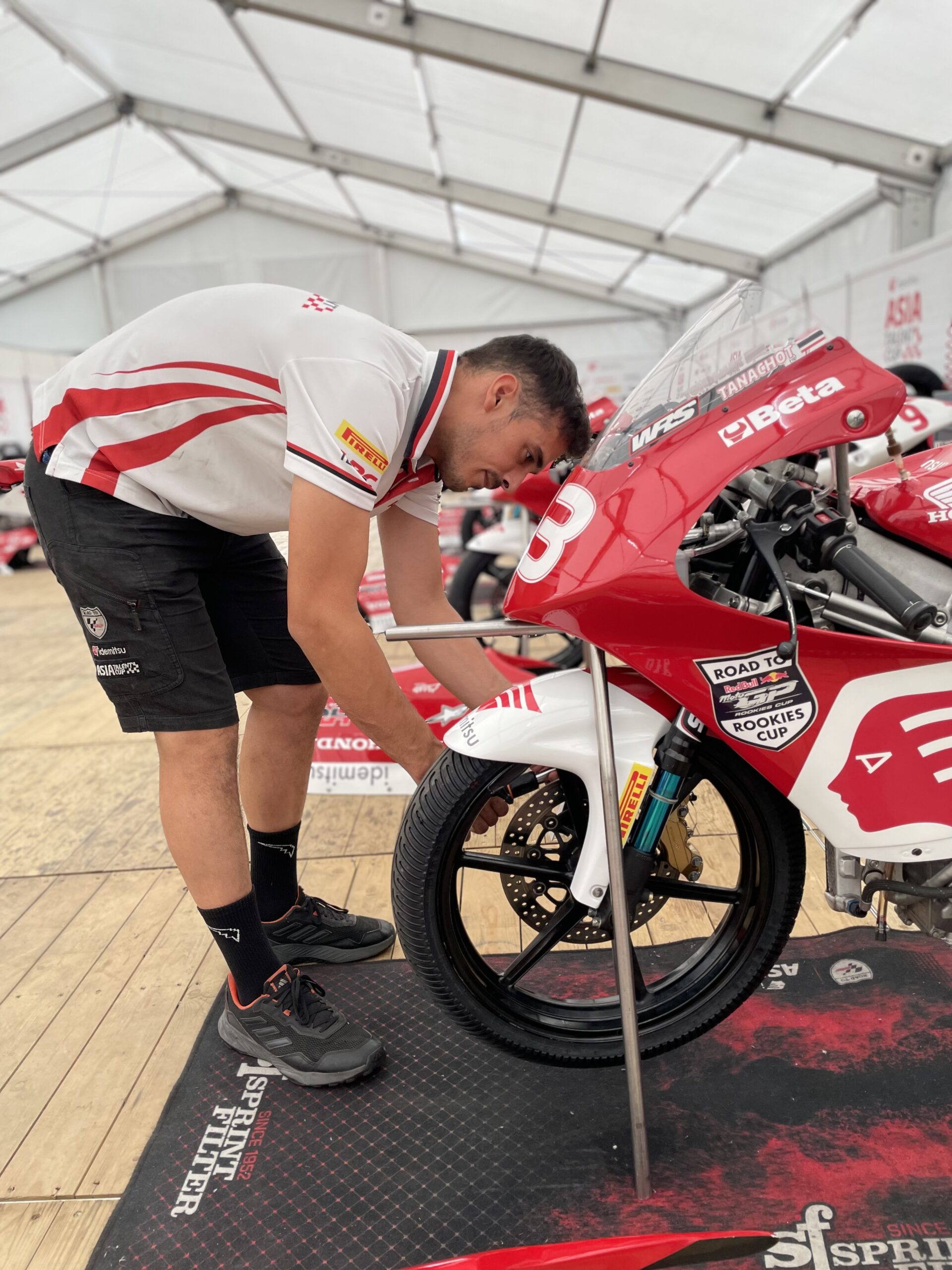 Esta copa se realiza con las Honda NSF 250.Todos los pilotos con la misma moto.Trabajamos en la parte ciclo y suspensiones para ayudar a cada piloto por igual.